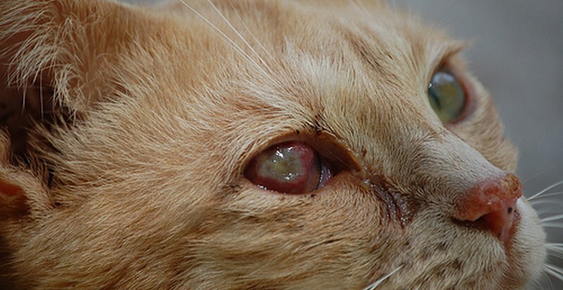 - Язвы роговицы, сопровождающиеся болью. Кошка щурится, развивается светобоязнь, помутнение роговицы